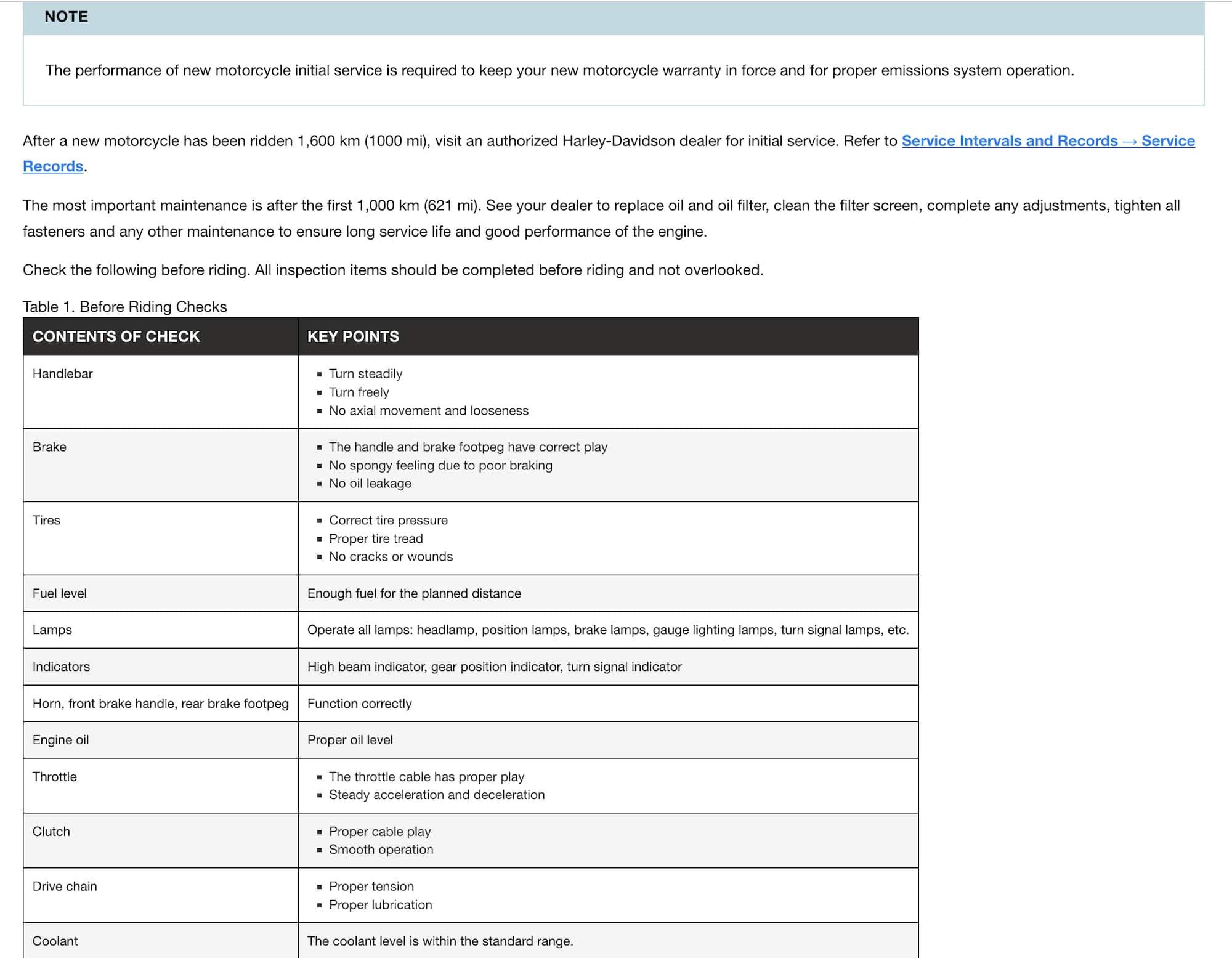 - Break-in service: Performed at 600 miles / 1,000 km at an authorized Harley-Davidson dealer.