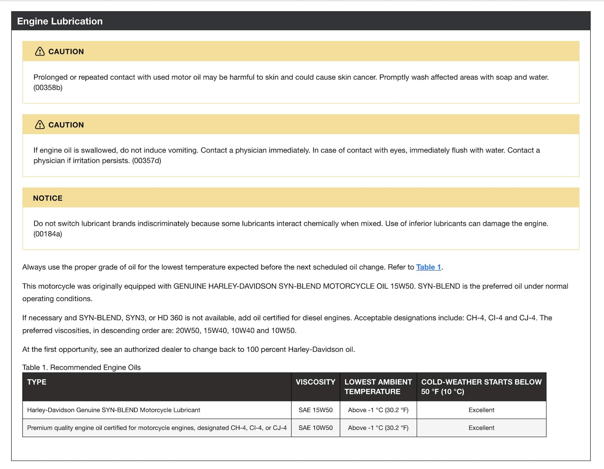 - Oil capacity is 3.0 L (with filter), and Harley recommends SYN-BLEND 15W50 engine oil for most riding conditions. Avoid mixing different brands or types of oil. Stick with Harley-Davidson-approved lubricants or diesel-rated oils (CH-4, CI-4, or CJ-4) if needed in a pinch.