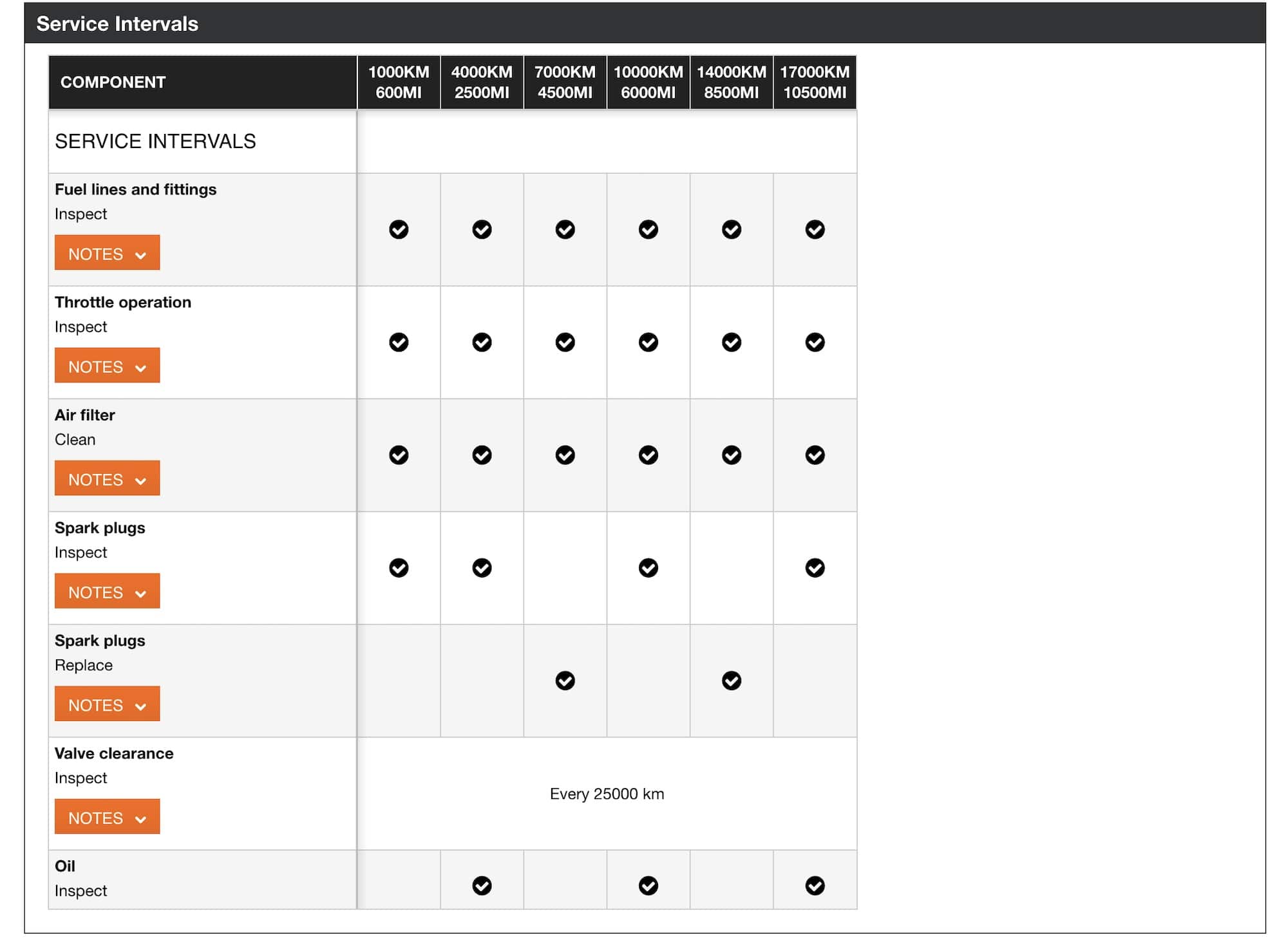 - Air filter service: If riding in dusty conditions, the air filter service interval should be performed more frequently: the first service at 500 km, followed by cleaning every 1,000 km.
