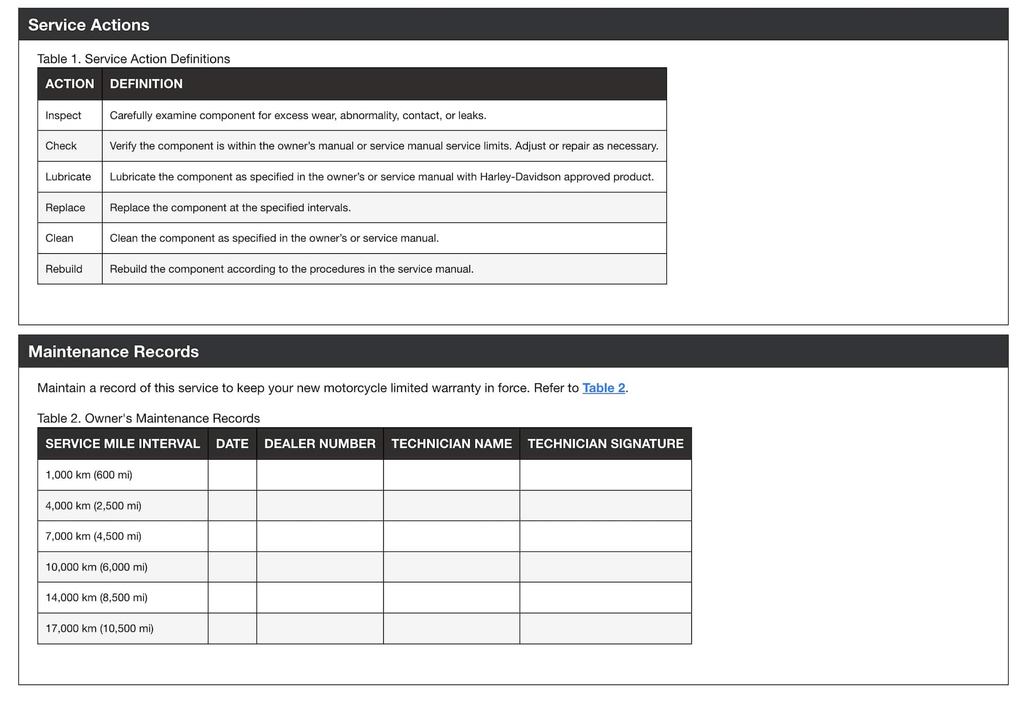 Harley-Davidson X500 2024 Maintenance Schedule Tables