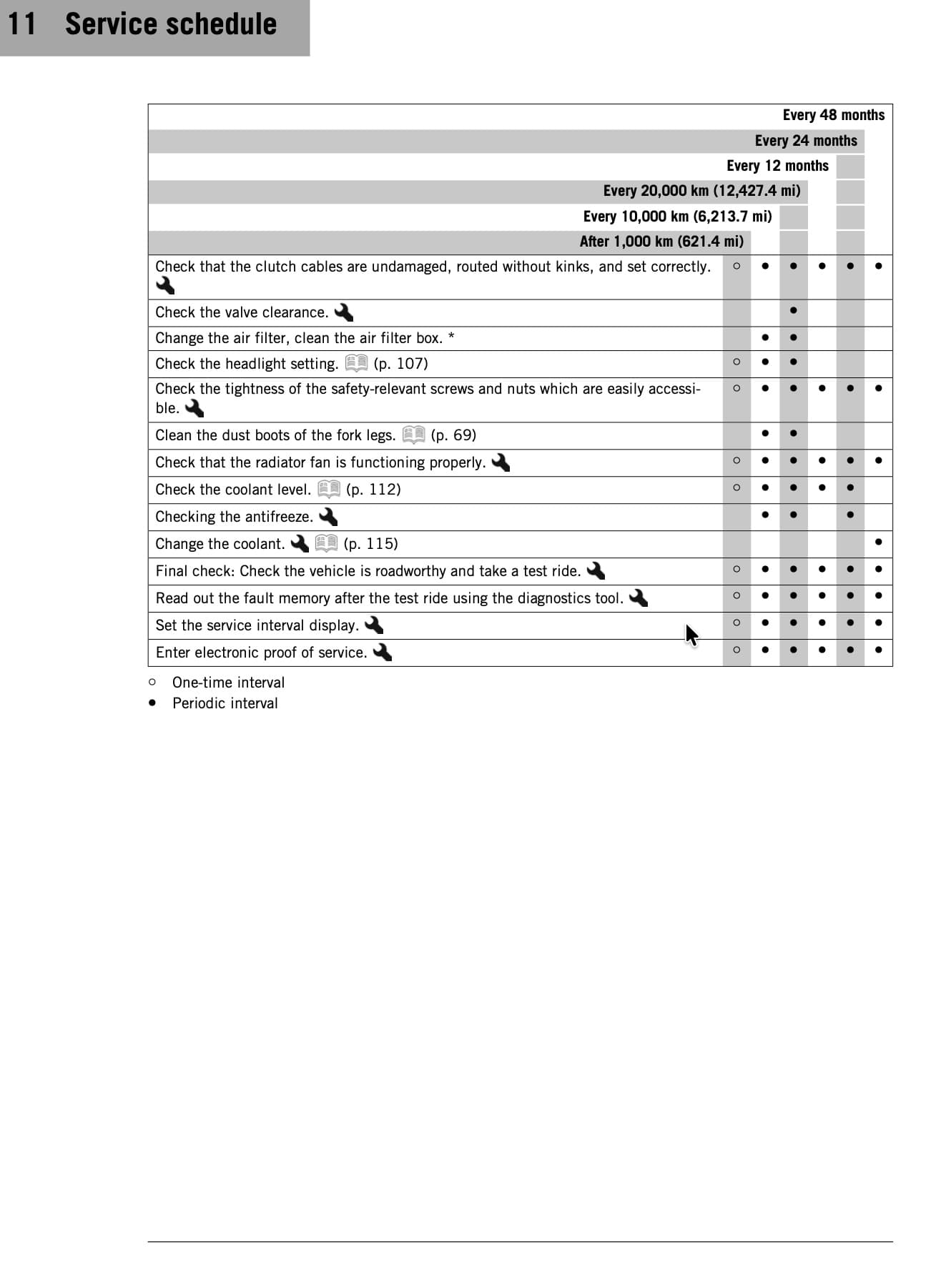 • Some items have a time-based schedule only (e.g. fluids), some a distance-based schedule only (e.g. valve clearance), but many items have both.