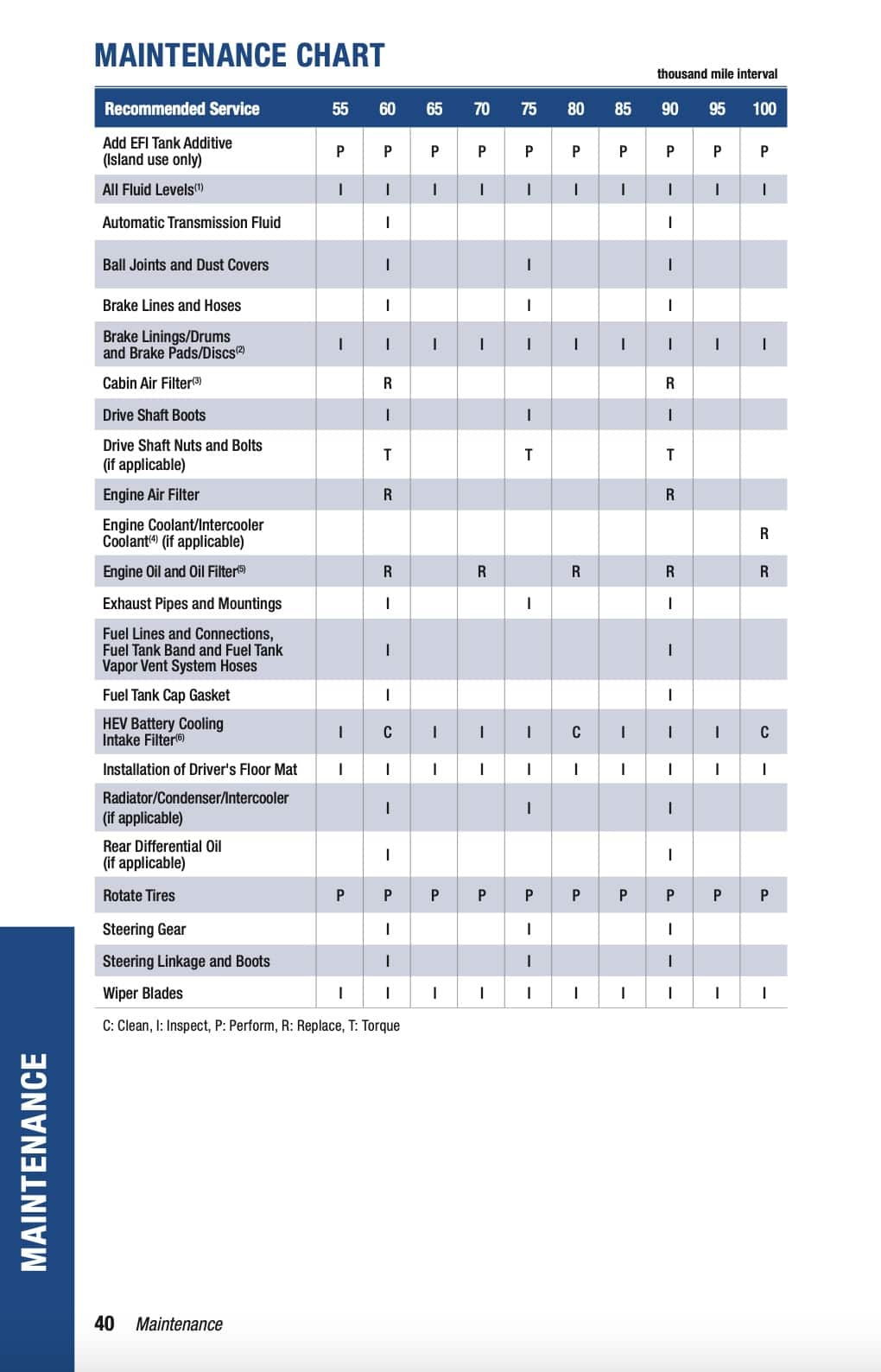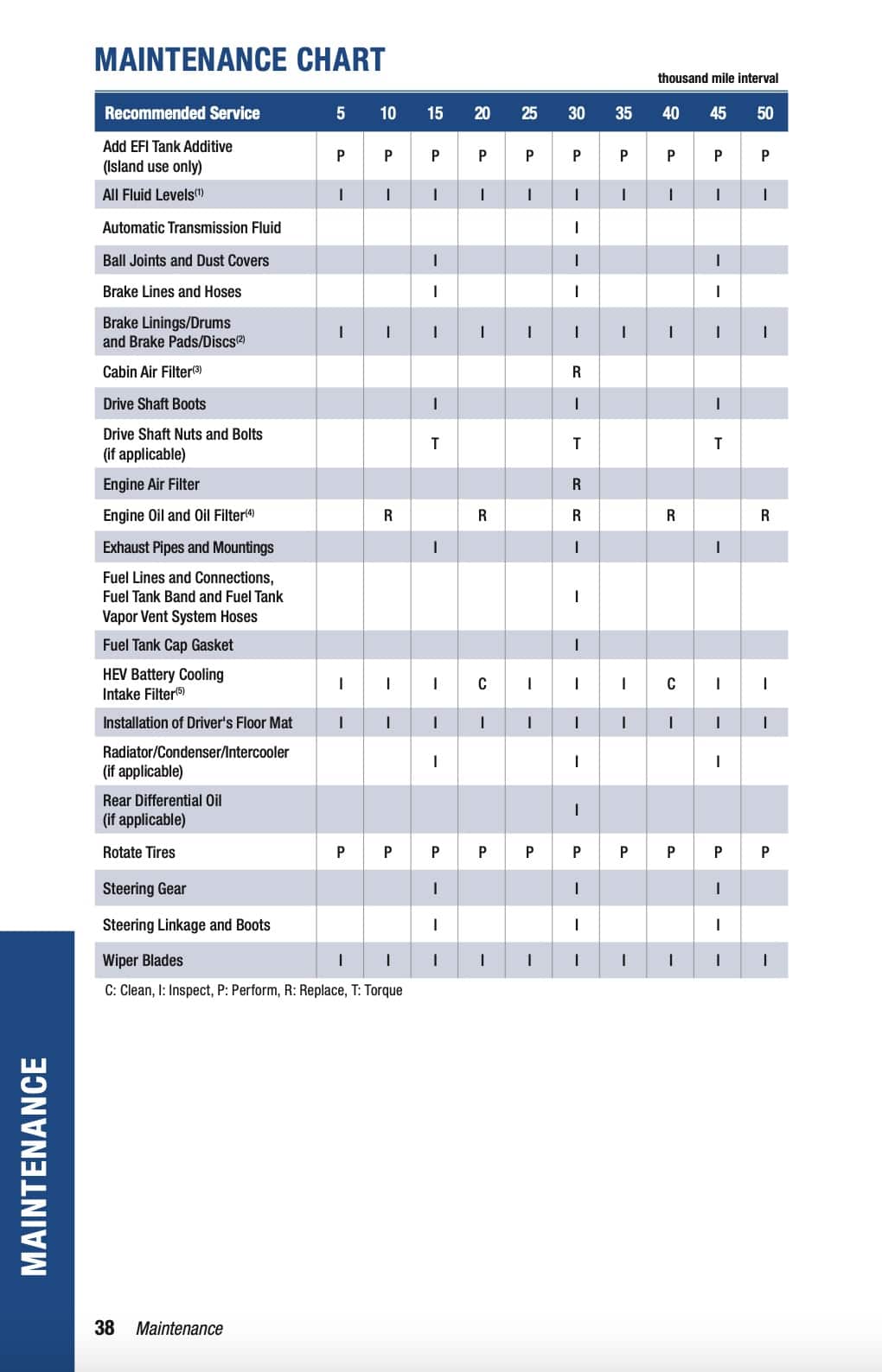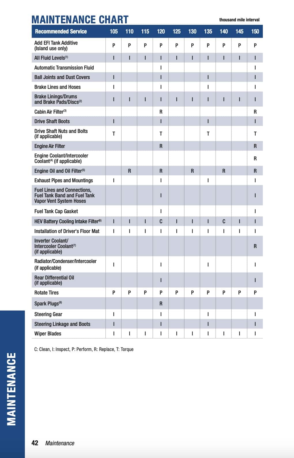C: Clean, I: Inspect, P: Perform, R: Replace, T: Torque
