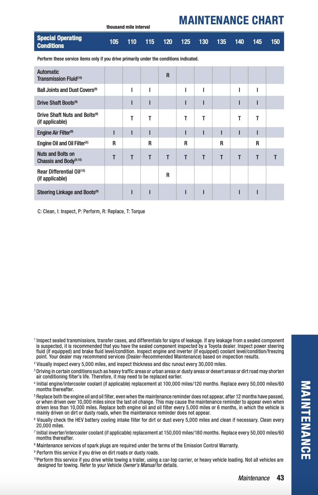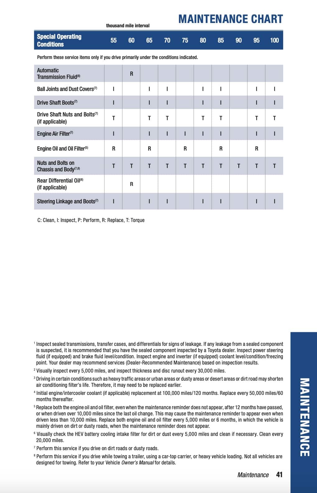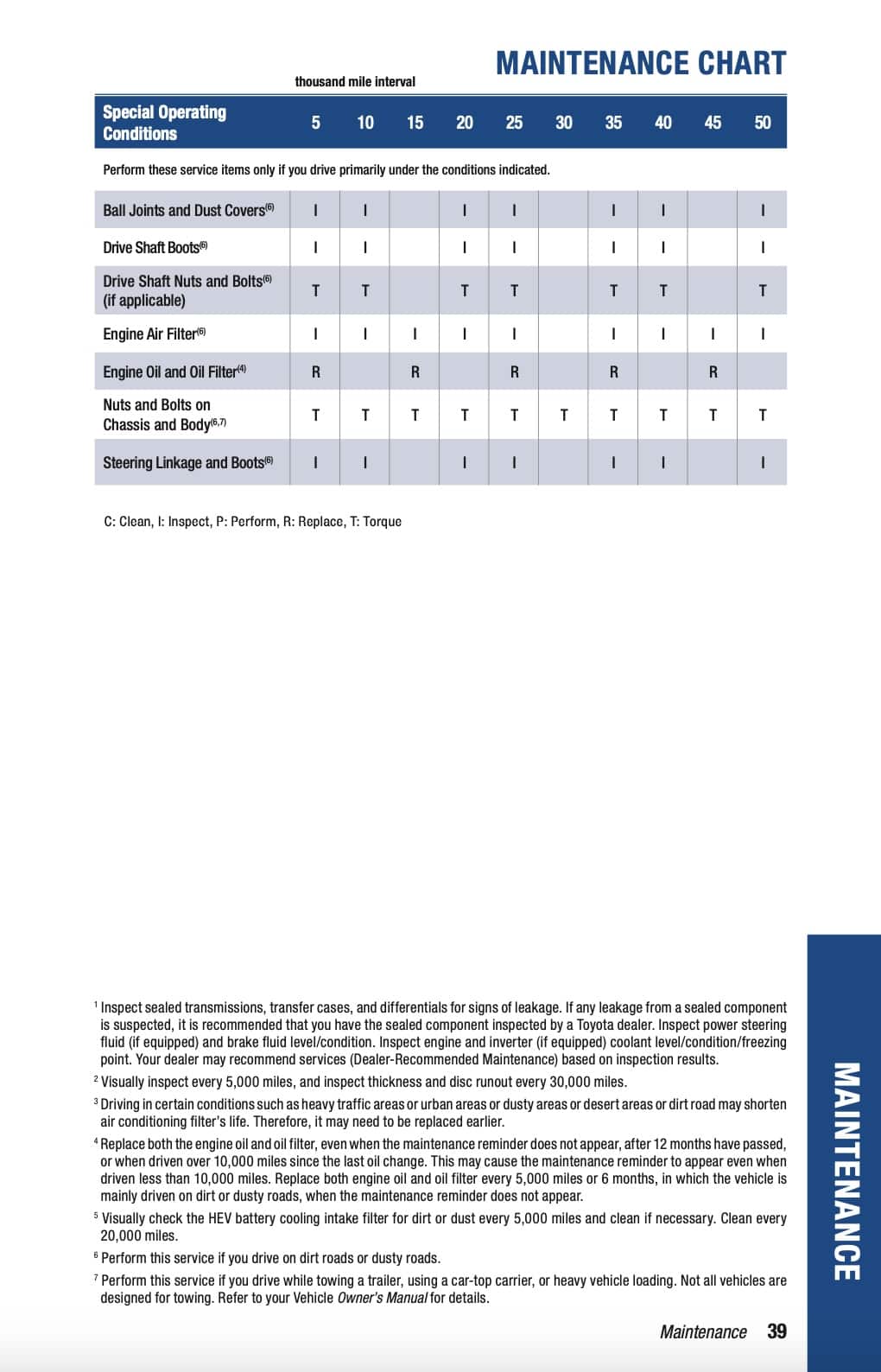 Toyota also lists additional maintenance items for special operating conditions every 5,000-miles / 6-months, whichever comes first. These only apply if the car is regularly driven under certain conditions, such as frequent short trips, extended idling, heavy loads, or dusty environments. In those cases, some items move from inspection to replacement, most commonly engine oil and the oil filter.