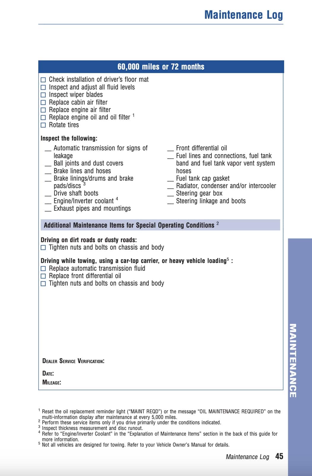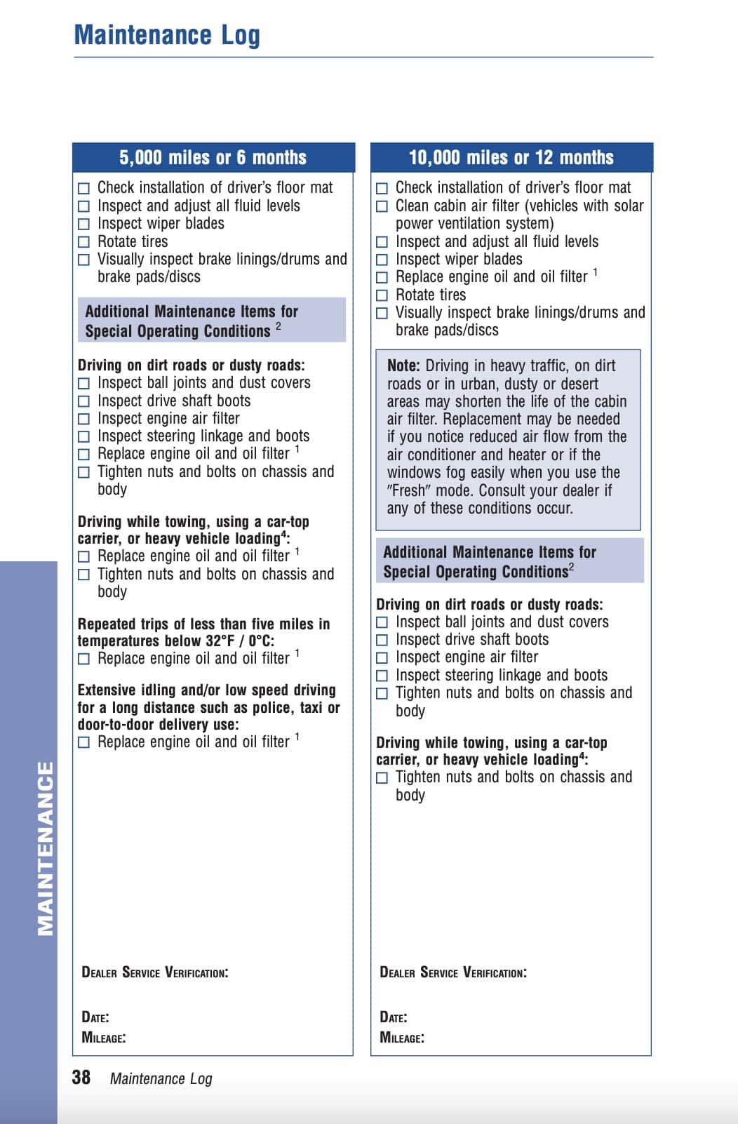 Maintenance ItemDirt / dusty roadsExtensive idling / low speed drivingRepeated short trips below 32°FTowing / heavy load