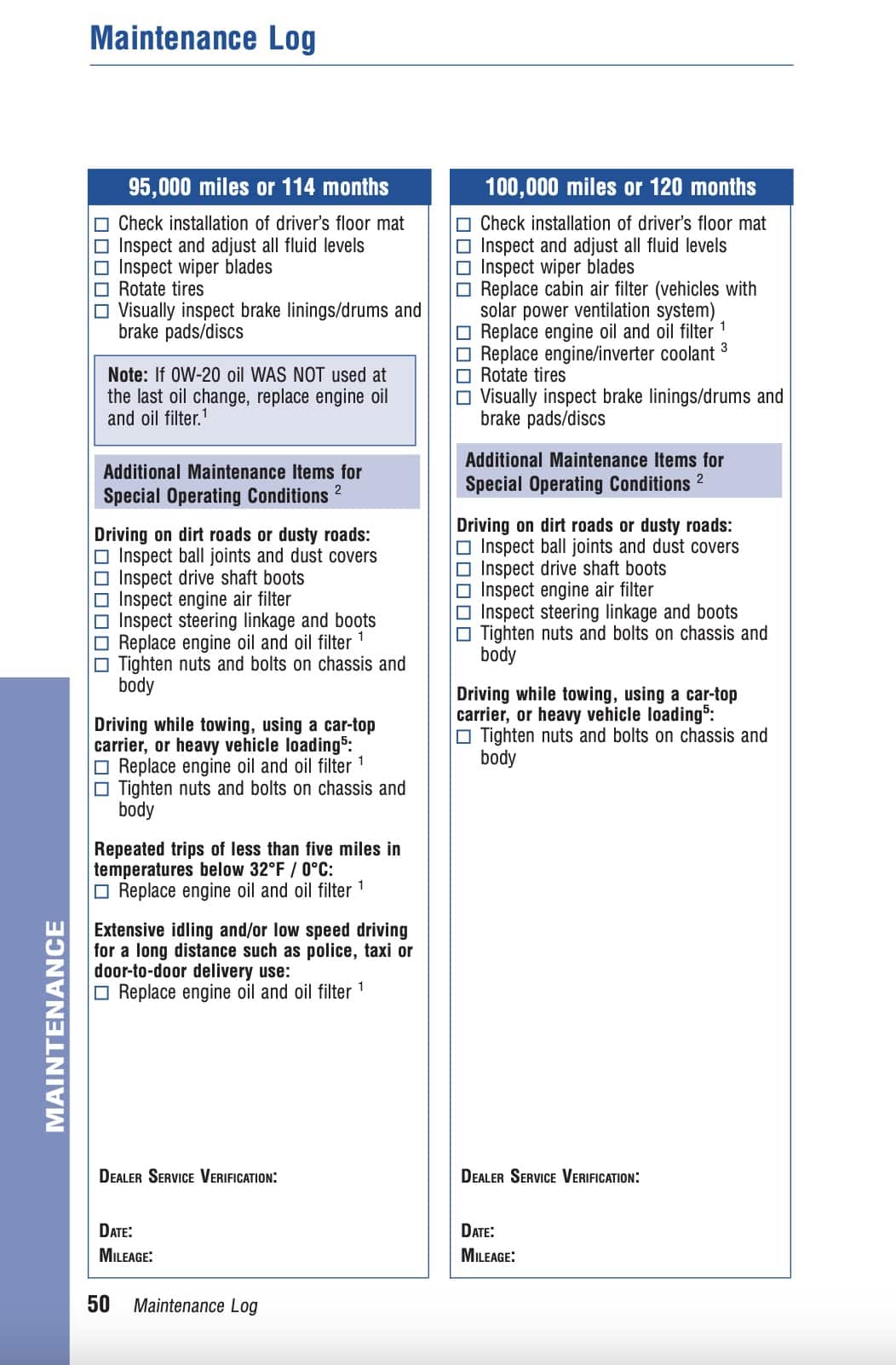 Where Toyota specifies different requirements based on oil type, driving conditions, or drivetrain configuration, those notes are included so the schedule can be followed accurately without referring back to the manual.
